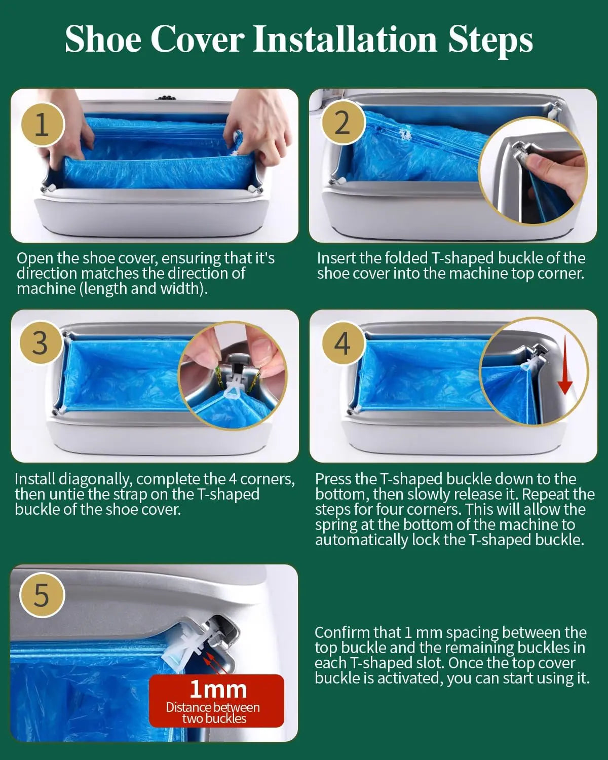 Easy Installation: Installing the shoe cover machine is incredibly simple. Just press the T-shaped button on the corner of the machine and insert the T-shaped button of the disposable shoe cover into the designated slot. Make sure the T-shaped button of the shoe cover is positioned underneath the machine. This straightforward installation process can be quickly and easily completed, saving you time and effort.